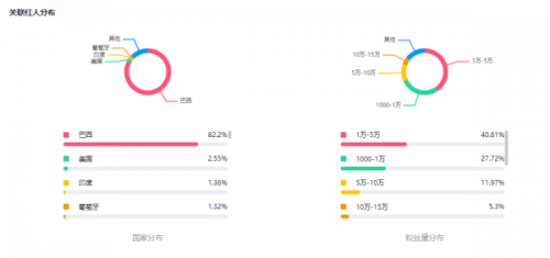 從WotoHub反饋的Veja關聯(lián)紅人分布情況來看,該品牌的主要目標市場為巴西,紅人占比82.2%。在整個營銷推廣策略中Veja集中選擇中長尾部紅人,合作粉絲量在1到15萬區(qū)間內的紅人數(shù)量占比85.6%。
