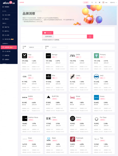 為了幫助品牌更好地解決這個問題,WotoHub海外紅人智能營銷云基于自身的品牌洞察功能,收集了不同行業(yè)的品牌紅人營銷動態(tài),讓品牌能夠快速洞察到行業(yè)動向,學習競品運營邏輯。同時能對競品合作的高互動、高播放量的營銷內容進行定向開發(fā),挖掘出更多適配的紅人資源。