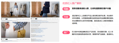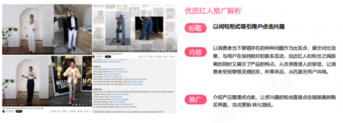 比如紅人好物測評,單品/合集強勢種草的玩法,通過標明品牌詞、品類詞或服裝產(chǎn)品賣點,視頻內容上進行服裝產(chǎn)品的全方位測評,精準滿足消費者訴求,影響消費者決策。