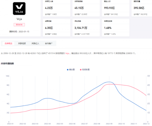 以榜首Veja為例,回望過去7年里,累計與42263個紅人聯(lián)動,觸達受眾 993.92億人次 ,其中帶貨紅人有 19773 個,帶貨視頻達 228850 條,內容累計點贊量達到6.35億,評論數(shù)超3000萬以上,品牌互動率為1.68%。