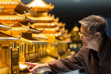 (上:花絲鑲嵌工藝大師姚迎春指導(dǎo)潮宏基“臻寶博物館”鎮(zhèn)館之寶“花絲風(fēng)雨橋”設(shè)計制作;