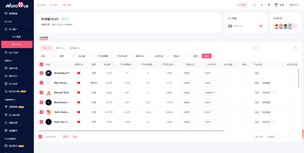 用戶可制定單個(gè)海外紅人營(yíng)銷推廣計(jì)劃項(xiàng)目,在系統(tǒng)內(nèi)導(dǎo)入紅人,與團(tuán)隊(duì)成員一同監(jiān)測(cè)紅人合作進(jìn)度、營(yíng)銷數(shù)據(jù)和費(fèi)用情況。