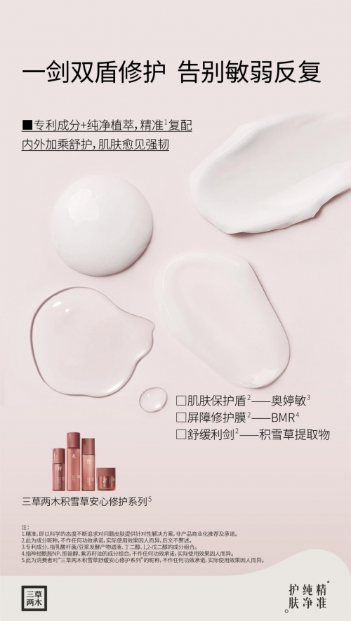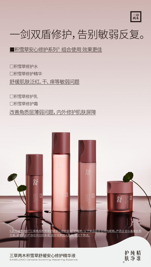 有了三草兩木積雪草安心修護系列,敏感肌冬季護理不再是難題,它適合各類膚質(zhì),尤其適用于皮膚屏障受損,出現(xiàn)干癢、泛紅、粗糙、掉皮等各類癥狀人群,皮膚敏感不用愁,讓三草兩木積雪草安心修護系列來幫助你,輕松擊退敏感癥狀,讓皮膚在寒冷的冬季也能保持細膩嫩滑,徹底和各種敏感問題說bye-bye!
