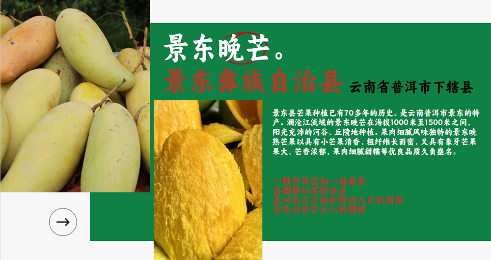 普洱景東晚芒比臨近縣晚熟1個(gè)月左右,種植在海拔1000米至1500米陽光充沛的河谷、丘陵地,適應(yīng)性強(qiáng)、長勢(shì)好、抗性強(qiáng)、掛果率高、落果少、不裂果、留樹時(shí)間長、品質(zhì)好。每年9月至11月成熟,平均單果重450g,盛產(chǎn)期單株產(chǎn)量可達(dá)50kg至80kg。果實(shí)汁多、肉質(zhì)細(xì)嫩、纖維少,肉質(zhì)沙甜、果香風(fēng)味獨(dú)特,可溶性固形物含量22.74%,總糖19.98%,味香甜、香氣濃,品質(zhì)上等,因其優(yōu)良品質(zhì)在周邊享有盛名。景東晚芒+傳統(tǒng)原制,克服了熟果不耐運(yùn)輸?shù)碾y題,讓樹熟芒果的香甜有了機(jī)會(huì),物美價(jià)優(yōu)地走進(jìn)遙遠(yuǎn)地區(qū)更多消費(fèi)者的生活。