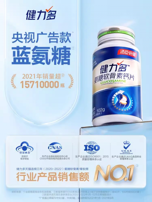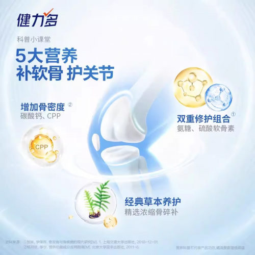 想要延長關(guān)節(jié)“壽命”,就一定要養(yǎng)成良好的運(yùn)動習(xí)慣,適度能夠促進(jìn)體內(nèi)的新陳代謝,調(diào)節(jié)體內(nèi)的激素平衡,維持身體健康,同時也要及時給關(guān)節(jié)補(bǔ)充營養(yǎng)。其中氨基葡萄糖(以下簡稱“氨糖”)是軟骨內(nèi)的重要組成成分,可以促進(jìn)軟骨細(xì)胞的生成。隨著年齡的增長,體內(nèi)的氨基葡萄糖含量越來越少,因此,適當(dāng)補(bǔ)充氨糖可以催生關(guān)節(jié)滑液、減少關(guān)節(jié)軟骨磨損、預(yù)防膝關(guān)節(jié)的退變。此外,適當(dāng)補(bǔ)鈣可以預(yù)防骨質(zhì)疏松,減緩鈣質(zhì)流失,有助于保護(hù)膝關(guān)節(jié)。當(dāng)然也可以多曬太陽,促進(jìn)鈣的吸收。而健力多氨糖軟骨素鈣片采用