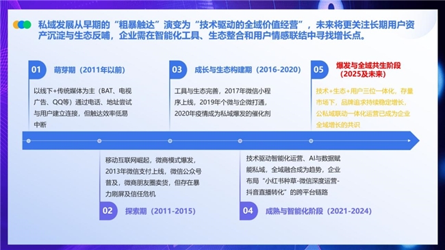 私域發(fā)展已從早期“地址觸達(dá)”走向“技術(shù)驅(qū)動(dòng)全域共生”。粗放的“無(wú)差別群發(fā)”模式面臨瓶頸: