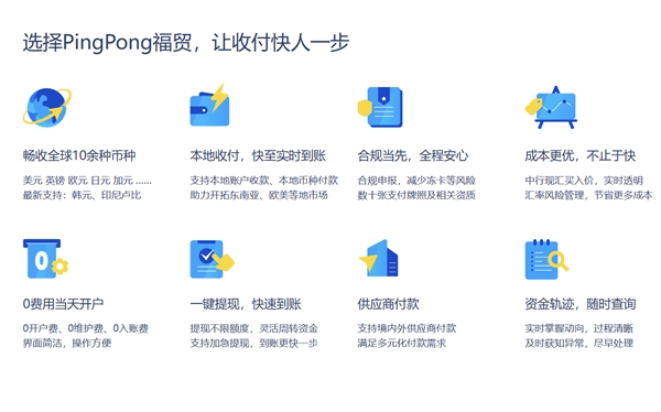 此外,對于從事外貿(mào)出口業(yè)務(wù)的企業(yè)來說,如何高效、安全、低成本收取訂單款項(xiàng)也是生意能否做大做強(qiáng)的關(guān)鍵。相比傳統(tǒng)的T/T電匯,PingPong旗下的外貿(mào)B2B收付款產(chǎn)品——福貿(mào)擁有多國本地賬戶的優(yōu)勢:首先是成本低,因?yàn)門/T打款一般情況下付費(fèi)基本上在50美金一單,有的時候中間行多一些,甚至可能到100美金、200美金,同時時效也很難保證,銀行一般會告知2-7個工作日內(nèi)到賬。并且PingPong福貿(mào)提供的多國本地賬戶基本沒有轉(zhuǎn)賬費(fèi);第二是用海外本地清算系統(tǒng),類似于中國企業(yè)直接通過銀聯(lián)轉(zhuǎn)賬,結(jié)算效率也會更高,大部分付款能當(dāng)天到賬。