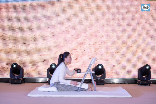 (圖片說明:2023絲漣中國睡感報告現(xiàn)場顏意娜教授分享睡前瑜伽放松動作)