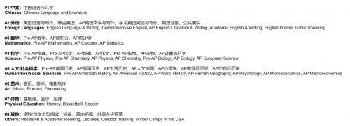 佳蓮學(xué)校的AP課程體系包括北京四中特色課程、高標(biāo)準(zhǔn)美國(guó)高中核心課程和AP課程(即美國(guó)大學(xué)預(yù)修課程),分為七大板塊及其他特色課程。學(xué)生可以根據(jù)學(xué)校學(xué)分要求,按年級(jí)和自身情況進(jìn)行選課,具體開設(shè)課程有: