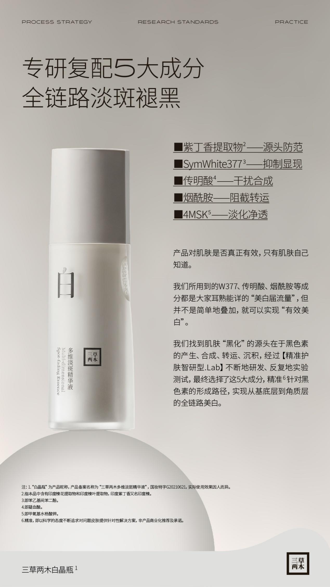 在經(jīng)過三草兩木“精準護膚智研型.Lab”不斷研發(fā)、反復實驗、測試改進后,最終選擇了紫丁香提取物、SymWhite377、傳明酸、煙酰胺、4MSK為五大核心成分,從源頭防范、抑制顯現(xiàn)、干擾合成、阻截轉運、淡化凈透入手來實現(xiàn)全鏈路淡斑褪黑,達到精準及真正有效的美白效果。并且團隊深知:W377、傳明酸、煙酰胺等成分可謂是大家耳熟能詳?shù)摹懊腊讓昧髁俊?,但這些成分并不是簡單疊加起來就能實現(xiàn)“有效美白”,成分的含量、安全性及純度等,都對美白效果起著至關重要的作用。正是經(jīng)過長時間不斷地調試,三草兩木白晶瓶才最終誕生,并且在各方面均達到或超過研發(fā)團隊預期效果,成為一款真正意義上的“美白利器”。