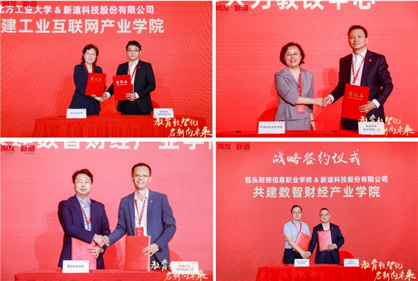 同時,為深化校企合作,打造產(chǎn)教融合共同體。會議期間,新道科技與21所院校舉行校企合作戰(zhàn)略簽約儀式。