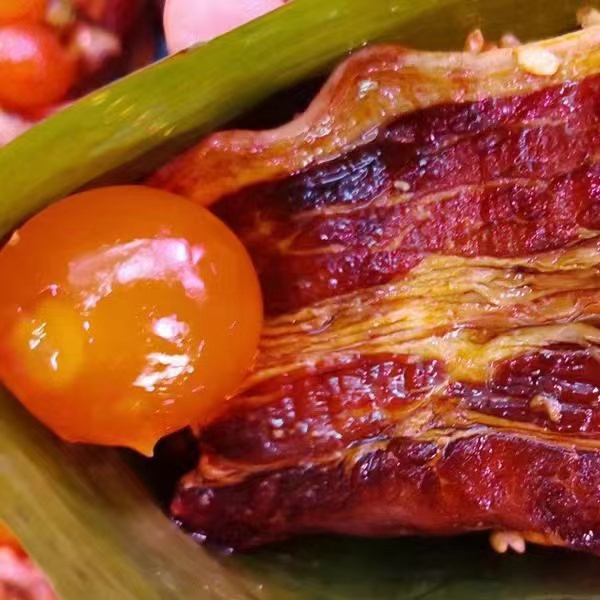 每一個粽子足足有半斤重,聽老板說粽子是小火慢燉6小時,然后再燜煮2小時才出鍋。我運氣正好,正好趕上了老板新鮮出鍋的粽子,老遠就味道了粽香味,老板見我饞得不行,拿了個讓我吃吃看。