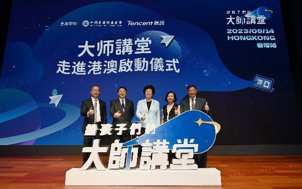 現(xiàn)場圖:中國宋慶齡基金會(huì)主 席李斌、香港中聯(lián)辦副主任尹宗華、香港民政與青年事務(wù)局局長麥美娟、騰訊集團(tuán)高級副總裁郭凱天、香港洛士文基金創(chuàng)會(huì)會(huì)長胡曉明共同啟動(dòng)“《給孩子們的大師講堂》走進(jìn)香港”。
