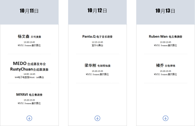在展會首日,即10月11日星期三,與會者可以前往W4 電子電音館的Music Lab舞臺觀看來自RustyChuan的合成器演奏;在Donner唐農(nóng)主展位W5C52,日本吉他演奏家MIYAVI將使用唐農(nóng)Donner Arena2000綜合效果器展示其極具特色的slap風格吉他技法。來自中國臺灣的知名貝司演奏家楊艾森也將會在展會首日于Donner 唐農(nóng)展位進行貝司演奏和產(chǎn)品試用。