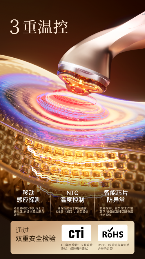 相比于其他美容儀的溫控系統(tǒng),玉如意美容儀還有三重安全保護(hù):移動感應(yīng)探測功能、NTC溫度控制和芯片控制,確保美容儀時刻維持黃金溫度(38-43度),杜絕燙傷,讓用戶居家使用更安心。