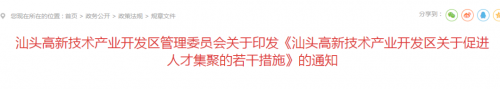 汕頭高新技術(shù)產(chǎn)業(yè)開發(fā)區(qū)為促進人才集聚,發(fā)布人才獎勵措施: