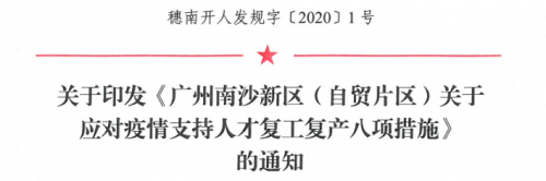 南沙區(qū)人才、科技、人社、住建四部門聯(lián)合印發(fā)《廣州南沙新區(qū)(自貿(mào)片區(qū))關(guān)于應(yīng)對疫情支持人才復(fù)工復(fù)產(chǎn)八項措施》。