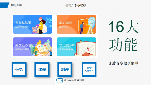 值得一提的是,桂花樹下自主開發(fā)的國內(nèi)首家大數(shù)據(jù)升學(xué)平臺(tái)——桂花升學(xué)小程序,貫通K12階段到高考升學(xué)的一站式生涯規(guī)劃,涵蓋升學(xué)大數(shù)據(jù)管理、家庭教育及升學(xué)規(guī)劃專業(yè)知識(shí)普及、共性問題解決、個(gè)性化問題咨詢、家校社協(xié)同育人五個(gè)關(guān)鍵維度,滿足教育行政主管部門、學(xué)校、企事業(yè)單位、社會(huì)組織、家長在家庭教育及生涯規(guī)劃領(lǐng)域的多樣化需求。