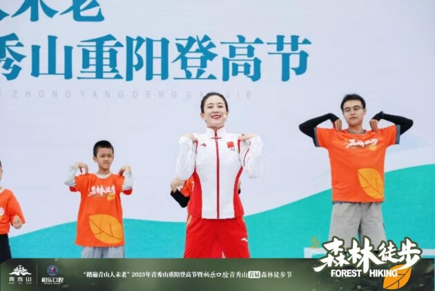 上午9點半,幾百名森林徒步健兒集結(jié)青秀山西門,隨后,在柏樂口腔隆重特邀有著健美操一姐之稱,獲得過九個世界冠軍的黃晉萱女士親臨現(xiàn)場下。整個森林徒步的熱身現(xiàn)場氛圍十分活躍,8名徒步愛好者爭相上臺,在世界冠軍的帶領下同臺展示了專業(yè)活力的熱身運動。