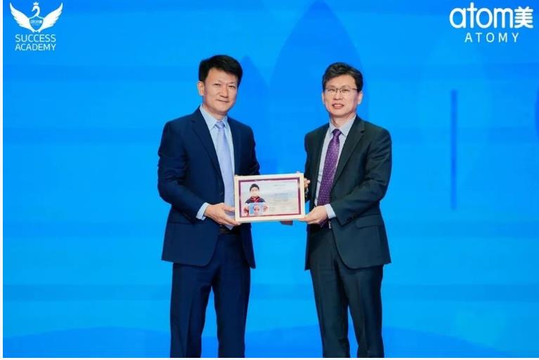 儀式中,王曉衛(wèi)總裁為艾多美(中國)有限公司總經(jīng)理樸炳寬,送上了微笑行動榮譽大使的證書。