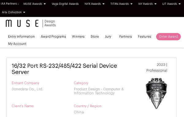 近日,2023年度美國繆斯設計獎(Muse Design Award)獲獎名單正式揭曉。三旺通信NP5100安全串行設備服務器榮獲產(chǎn)品設計類銀獎。
