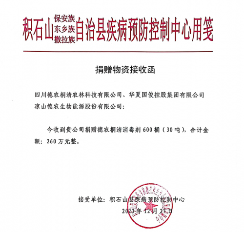 2023年12月19日甘肅省積石山縣發(fā)生6.1級地震,牽動了全國人民的心,一批有責(zé)任擔(dān)當(dāng)?shù)钠髽I(yè)紛紛伸出友愛之手,2023年12月26,由四川德農(nóng)桐清農(nóng)林科技有限公司、涼山德農(nóng)生物能源股份有限公司和華夏國俊控制集團(tuán)有限公司捐贈,環(huán)球應(yīng)急救援西部指揮中心和中管院崇高健康大舞臺管理中心支持的德農(nóng)桐清消毒劑30噸,價值260萬元從成都市啟程,運往甘肅省積石山縣。此次捐贈的消毒劑無毒、無味、無刺激、無腐蝕,可殺滅流感病毒、金黃色葡萄球菌、大腸桿、銅綠假單胞菌和白色念珠菌等菌種,滅殺率達(dá)到99.999%,非常適合災(zāi)區(qū)的環(huán)境消殺。
