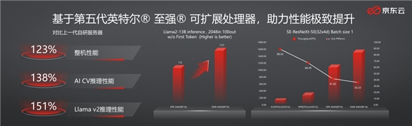 京東大模型第 一次亮相就收獲完美成績,很大程度上要歸功于其部署的基于第五代英特爾? 至強? 可擴展處理器的新一代自研服務(wù)器,與上一代自研服務(wù)器相比整機性能提升23%,關(guān)鍵的AI CV推理性能與 Llama v2大模型推理性能更是分別提升38%與51%。