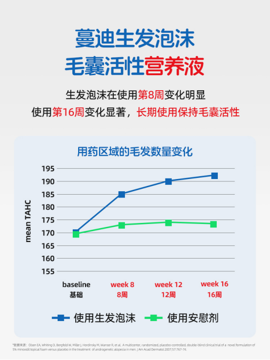 優(yōu)勢三:準(zhǔn)確給藥。傳統(tǒng)的溶液劑易揮發(fā),擦在頭皮上易析出結(jié)晶,影響藥物吸收。蔓迪泡沫劑中米諾地爾穩(wěn)定性更高,且具有不易揮發(fā)的特點(diǎn),可以幫助提升藥物使用效果,并做到準(zhǔn)確給藥。