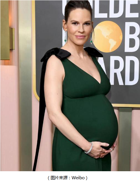 準媽媽希拉里·斯萬克身穿綠色無袖長裙,耳畔鉑金鑲嵌祖母綠寶石及鉆石的夸張耳環(huán)來自蒂芙尼(Tiffany & Co.)古董珍藏庫,和禮服顏色相呼應(yīng),盡顯溫柔端莊。
