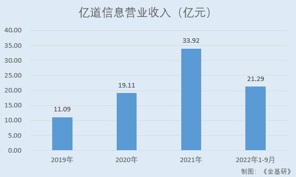 據(jù)招股書,2019-2021年及2022年1-9月,億道信息實現(xiàn)營業(yè)收入分別為11.09億元、19.11億元、33.92億元、21.29億元。