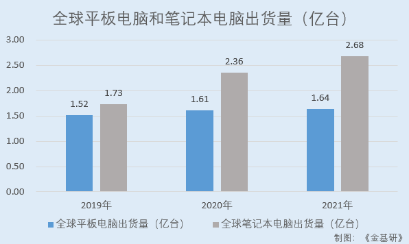 據(jù)Counterpoint數(shù)據(jù),2019-2021年,全球平板電腦出貨量分別為1.52億臺、1.61億臺、1.64億臺;據(jù)Canalys數(shù)據(jù),2019-2021年,全球筆記本電腦出貨量分別為1.73億臺、2.36億臺、2.68億臺。