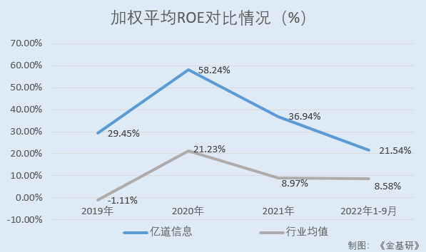 經(jīng)金基研計算,2019-2021年及2022年1-9月,上述五家億道信息同行業(yè)可比公司的加權(quán)平均ROE均值分別為-1.11%、21.23%、8.97%、8.58%。