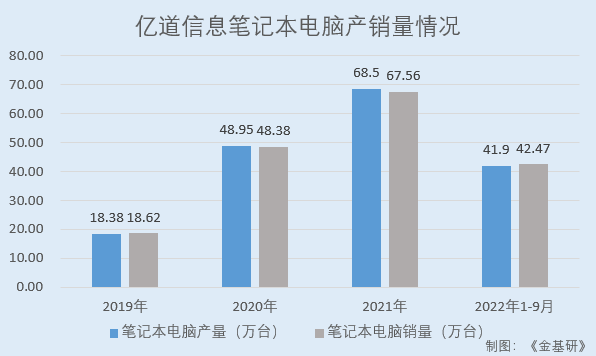 據(jù)招股書,2019-2021年及2022年1-9月,億道信息筆記本電腦的產(chǎn)量分別為18.38萬臺、48.95萬臺、68.50萬臺、41.90萬臺;銷量分別為18.62萬臺、48.38萬臺、67.56萬臺、42.47萬臺,產(chǎn)銷率分別為101.29%、98.84%、98.62%、101.37%。