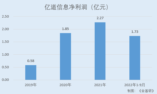 同期,億道信息實現(xiàn)凈利潤分別為0.58億元、1.85億元、2.27億元、1.73億元。