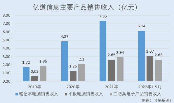 其中,2019-2021年及2022年1-9月,億道信息筆記本電腦銷售收入分別為1.72億元、4.87億元、7.35億元、6.14億元,占主營業(yè)務收入的比例分別為16.74%、26.62%、22.61%、29.98%;平板電腦銷售收入分別為0.62億元、1.25億元、2.65億元、3.07億元,占主營業(yè)務收入的比例分別為6.02%、6.82%、8.14%、15.01%;三防類電子產(chǎn)品銷售收入分別為1.86億元、2.10億元、2.94億元、2.63億元,占主營業(yè)務收入的比例分別為18.11%、11.46%、9.03%、12.86%。