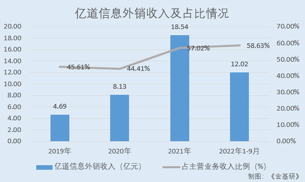 2019-2021年及2022年1-9月,億道信息主營業(yè)務收入中,外銷收入分別為4.69億元、8.13億元、18.54億元、12.02億元,占比分別為45.61%、44.41%、57.02%、58.63%。