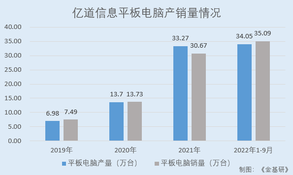 同期,億道信息平板電腦的產(chǎn)量分別為6.98萬臺、13.70萬臺、33.27萬臺、34.05萬臺,銷量分別為7.49萬臺、13.73萬臺、30.67萬臺、35.09萬臺,產(chǎn)銷率分別為107.32%、100.23%、92.18%、103.07%。