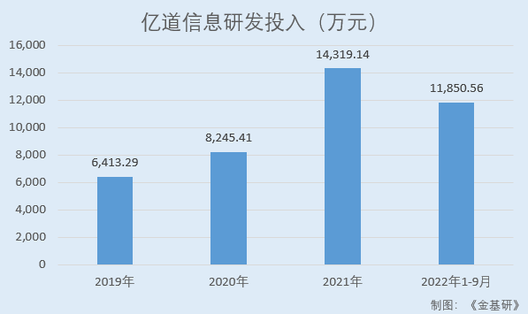 2019-2021年及2022年1-9月,億道信息研發(fā)投入分別為6,413.29萬元、8,245.41萬元、14,319.14萬元、11,850.56萬元,占營業(yè)收入的比例分別為5.78%、4.31%、4.22%、5.56%。