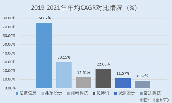 據(jù)東方財富choice數(shù)據(jù),2019-2021年,億道信息營業(yè)收入年均CAGR為74.87%。