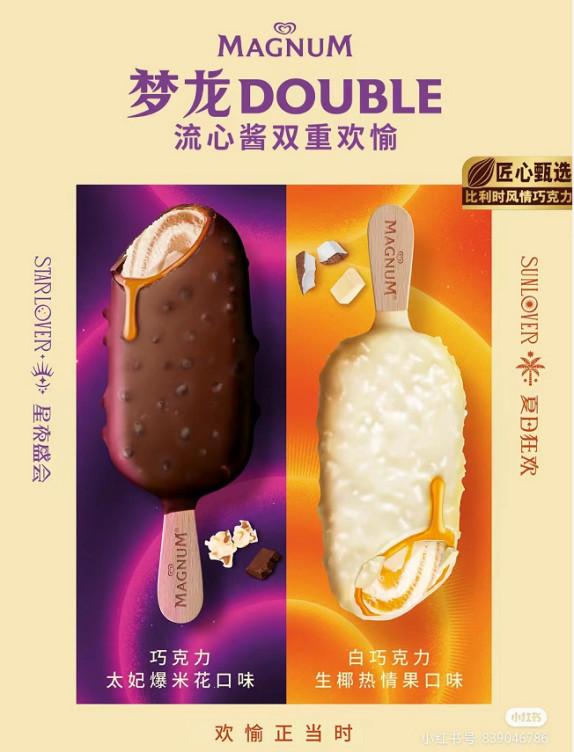 這次的夢龍全新日夜CP與此前推出的日夜CP不同的是,這次的夢龍雪糕里面包裹著濃郁的流心醬。屬于白天的夢龍DOUBLE生椰熱情果口味冰淇淋里面融合了熱情果芒果流心醬,口感酸酸甜甜,頗具特色;屬于黑夜的太妃爆米花口味冰淇淋則搭配了海鹽焦糖風味流心醬,口感咸甜,個性十足。