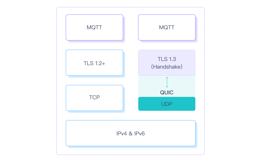 MQTT 5.0 定義了三種傳輸類型:TCP、TLS 和 WebSocket。在物聯(lián)網(wǎng)安全最 佳實(shí)踐中,MQTT over TLS/SSL 廣泛用于生產(chǎn)環(huán)境以保護(hù)客戶端和 Broker 之間的通信。然而它速度慢、延遲高,需要 3.5 個(gè) RTT,即 TCP 3 次握手以及 TLS 4 次握手才能建立新的MQTT 連接。