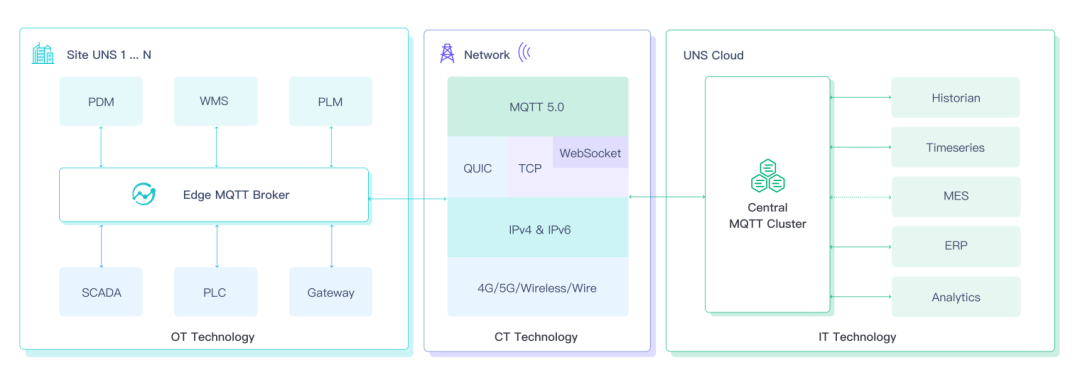 如今,通過 EMQ 提供的開源 MQTT 消息服務(wù)器 EMQX或NanoMQ,結(jié)合工業(yè)協(xié)議網(wǎng)關(guān)軟件 Neuron,用戶將可以構(gòu)建一個(gè)由 IT 界最先進(jìn)技術(shù)支持的統(tǒng)一命名空間架構(gòu)。
