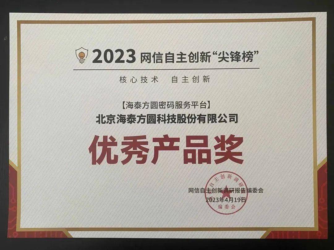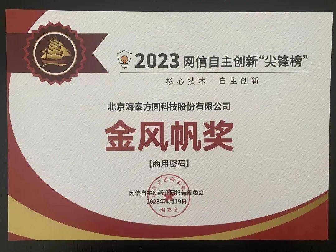 作為《報(bào)告》的積極貢獻(xiàn)者,海泰方圓受邀出席會(huì)議并榮登2023網(wǎng)信自主創(chuàng)新尖鋒榜,收獲四項(xiàng)榮譽(yù):公司總裁姜海舟成功晉升專(zhuān)家委名單,并帶領(lǐng)企業(yè)在網(wǎng)信領(lǐng)域砥礪前行,榮獲金遠(yuǎn)見(jiàn)獎(jiǎng);海泰方圓在網(wǎng)信自主創(chuàng)新的浪潮中乘風(fēng)破浪,榮獲企業(yè)金風(fēng)帆獎(jiǎng);海泰密碼服務(wù)平臺(tái)榮獲網(wǎng)信自主創(chuàng)新優(yōu)秀產(chǎn)品獎(jiǎng)。