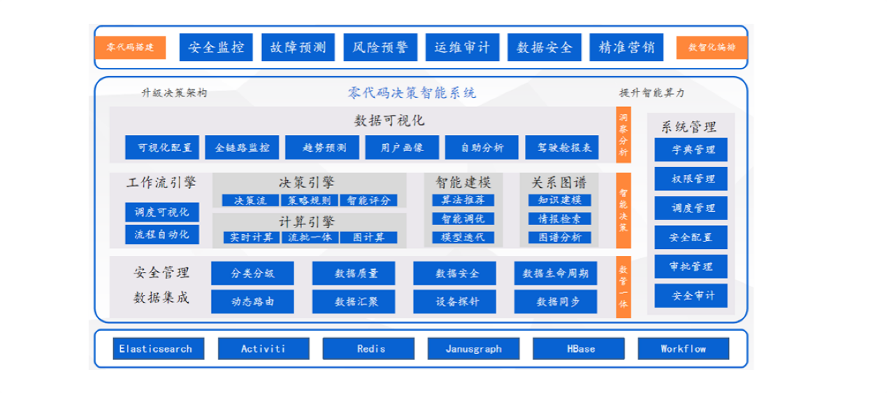 系統(tǒng)模塊化封裝代碼功能,利用工作流引擎數(shù)智化編排技術(shù),內(nèi)置決策引擎、知識圖譜、智能建模、流計算等數(shù)字化系統(tǒng)所需功能,通過圖形化界面、拖拽式選用功能模塊進行系統(tǒng)搭建,實現(xiàn)業(yè)務(wù)快速上線,無需技術(shù)定制。