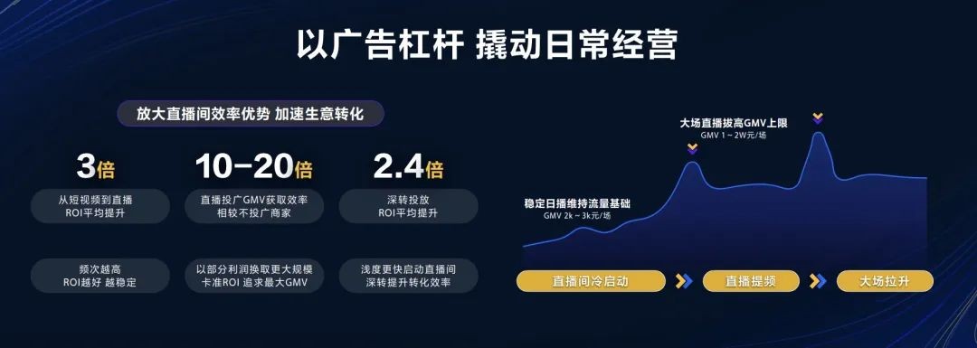 在此基礎(chǔ)上,適時利用巨量引擎的廣告投放就可以撬動更多流量,讓經(jīng)營更上一層樓。商家進行直播加熱后,GMV的獲取效率可以提升10-20倍,通過廣告撬動日常經(jīng)營的杠桿作用可見一斑。