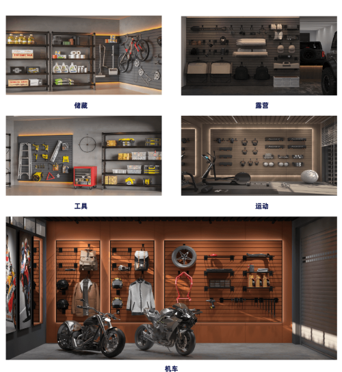 在集成車庫展區(qū),現(xiàn)場重點展示了涵蓋儲藏室、運動、機車、露營、工具房五大場景的集成車庫,滿足多重收納的儲藏室、靈活打造運動、機車等自由場景,重構(gòu)多元個性的歡樂空間。由大板吊頂、金屬掛件、5K木、不銹鋼掛柜等不怕水的專屬材料組成的車庫整體解決方案,應用不怕水的友邦專利奈時技術(shù),不僅不怕泡水,而且具有抑菌防霉、易清潔的特點。