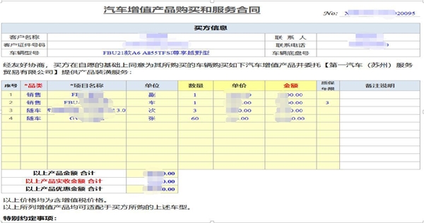 新車銷售合同包括三部分:整車銷售合同,增值產(chǎn)品銷售合同,委托服務(wù)合同。在合同上順帶對客戶信息進(jìn)行完整詳細(xì)登記。