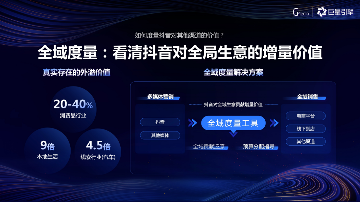 為了幫助品牌量化外溢價(jià)值,在全域經(jīng)營(yíng)中找出“全局最 優(yōu)”的解題思路,巨量引擎推出全域度量模塊,幫助品牌厘清前鏈路的營(yíng)銷投入與后鏈路生意轉(zhuǎn)化的關(guān)系,量化抖音營(yíng)銷行動(dòng)對(duì)全渠道的外溢轉(zhuǎn)化效果,生成科學(xué)的全域度量結(jié)果,并進(jìn)一步給出歸因、優(yōu)化,從而助力品牌獲得全渠道經(jīng)營(yíng)能力的提升,實(shí)現(xiàn)“全局最 優(yōu)”增長(zhǎng)。