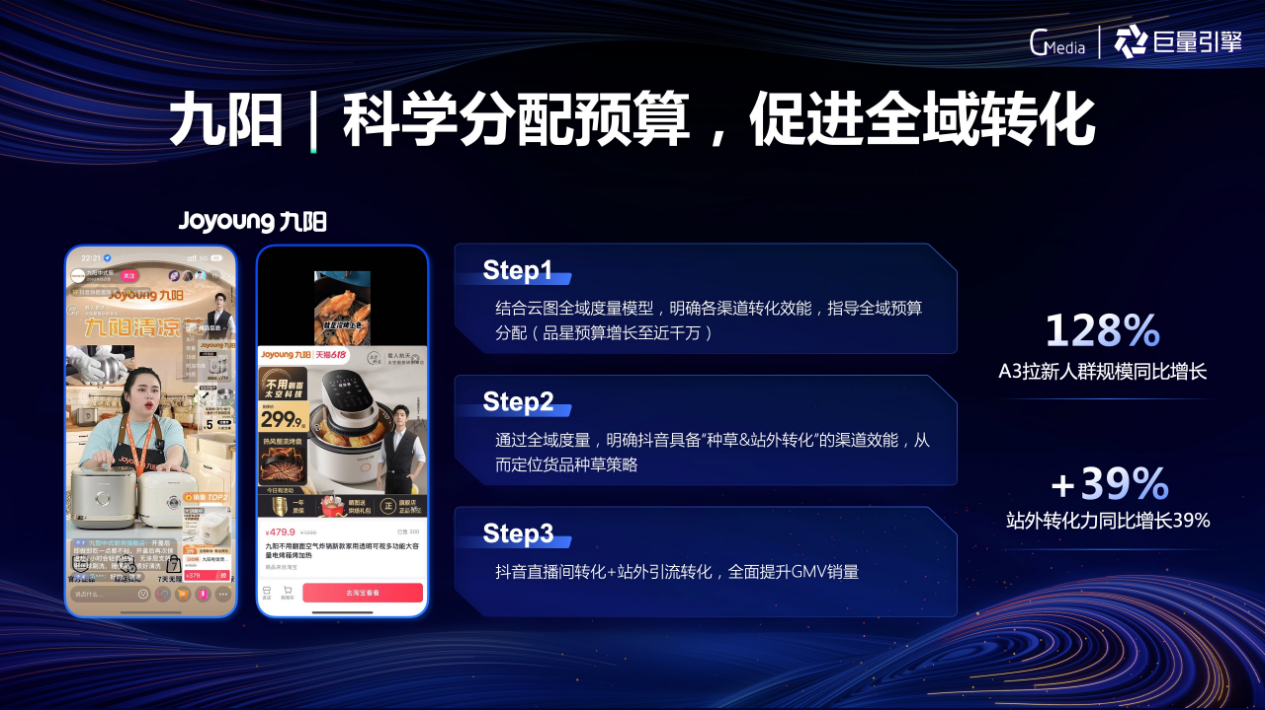 今年618,九陽最 大化發(fā)揮抖種全收的渠道效能,不僅應(yīng)用全域度量產(chǎn)品洞察不同觸點(diǎn)的效率,進(jìn)行GMV拆解,科學(xué)分配預(yù)算,同時(shí)錨定藍(lán)海品類,優(yōu)化內(nèi)容策略,強(qiáng)化抖音“種草力”。通過抖音直播和站外引流的方式,九陽實(shí)現(xiàn)了A3人群拉新規(guī)模同比增長(zhǎng)128%,站外轉(zhuǎn)化力同比增長(zhǎng)39%,極大帶動(dòng)了品牌力的規(guī)模、效率、形象提高,實(shí)現(xiàn)了全域GMV提升。