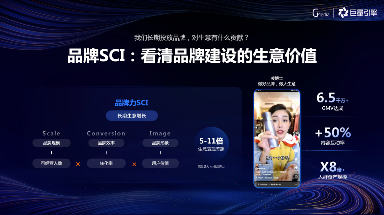 針對(duì)這個(gè)問題,巨量引擎通過SCI品牌力模型,將無形的品牌力分解為品牌規(guī)模、品牌效率和品牌形象三個(gè)要素,通過指標(biāo)品牌可進(jìn)行長(zhǎng)期GMV的相關(guān)性預(yù)演,真正看清品牌長(zhǎng)期建設(shè)與短期生意增長(zhǎng)的關(guān)系。通過不同行業(yè)的品牌印證,高品牌力對(duì)比低品牌力,在長(zhǎng)期生意表現(xiàn)上有5-11倍的差距。